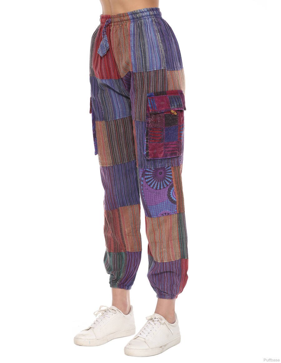 Cotton Stonewash Stripe Patches Boho Hippie Harem Pants Purple XXXL