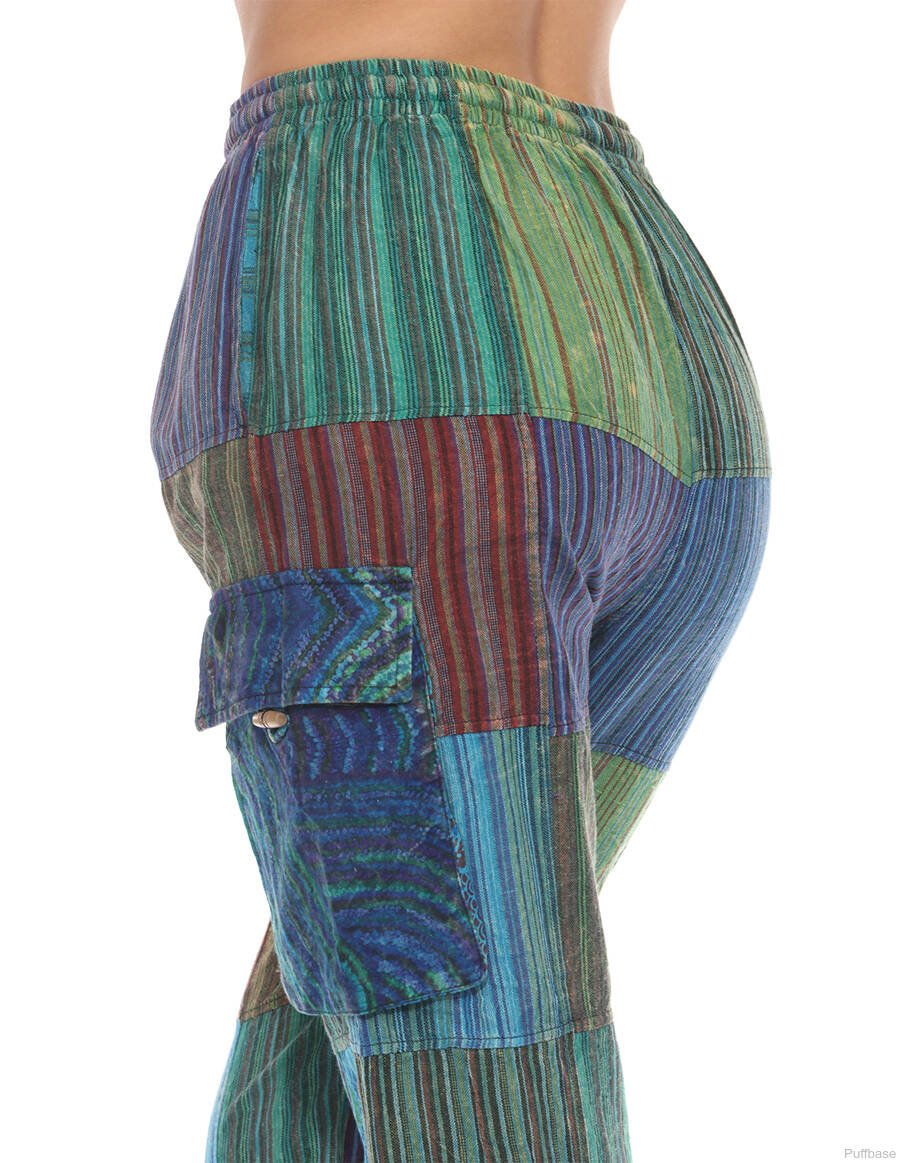 Cotton Stonewash Stripe Patches Boho Hippie Pants Turquoise XXXL